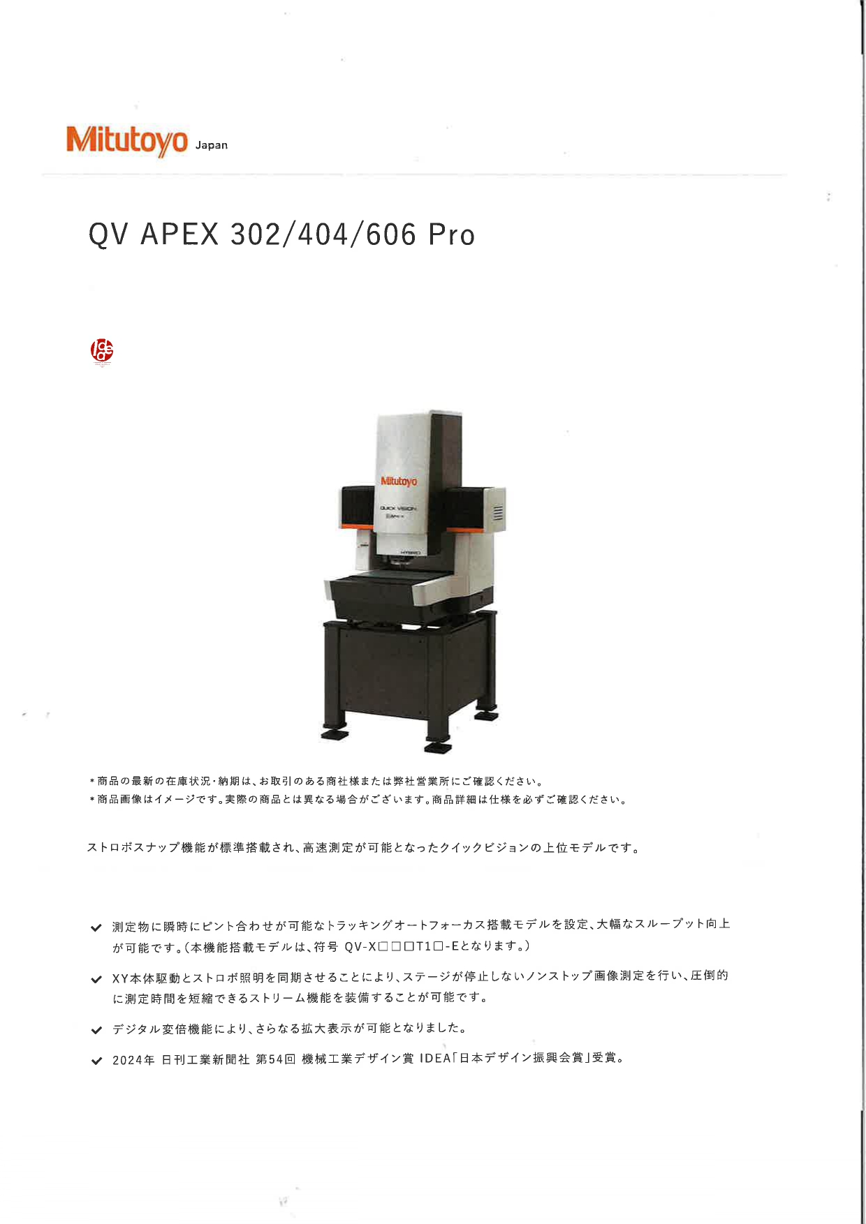 - 測定物に瞬時にピント合わせが可能なトラッキングオートフォーカス搭載モデルを設定、大幅なスループット向上が可能です。(本機能搭載モデルは、符号 QV-X□□□T1□-Eとなります。) XY本体駆動とストロボ照明を同期させることにより、ステージが停止しないノンストップ画像測定を行い、圧倒的に測定時間を短縮できるストリーム機能を装備することが可能です。 デジタル変倍機能により、さらなる拡大表示が可能となりました。 2024年 日刊工業新聞社 第54回 機械工業デザイン賞 IDEA「日本デザイン振興会賞」受賞。 詳細は以下のURLをクリック ホームページ ・https://x.gd/AXrq2