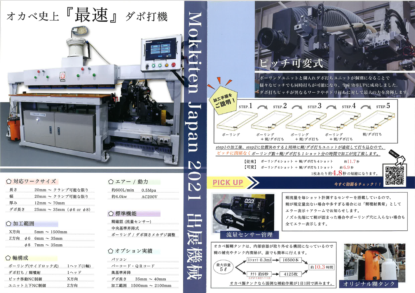 - 【概要】 ボーリングユニットと糊入れ・ダボ打ちユニットを分割してピッチを可変しながら加工を行う片面ボーリングダボ打機です。 【ポイント】 オカベ史上最速のダボ打機となりました。 ボーリングユニットと糊入れ・ダボ打ちユニットを個別にすることで様々なピッチでも同時打ちが可能となりタクトタイムの大幅短縮に成功しました。 ダボ打ちピッチが異なるワークやチドリ打ちに対して最大の力を発揮します。 【サイズ】 横幅:3,300mm 奥行:1,400mm 高さ:2,000mm 【NC制御】 ボーリング:1軸 糊噴射:1軸 ダボ打ち:1軸 ピッチ移動:NC制御 ユニット上下:NC制御